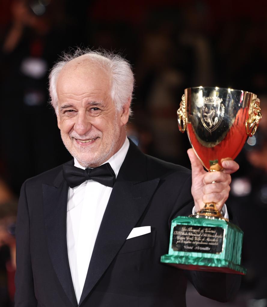 9月6日,在意大利威尼斯,最佳男演员奖获得者、电影《恩典》演员托尼·瑟维洛与奖杯合影。新华社记者 李京 摄