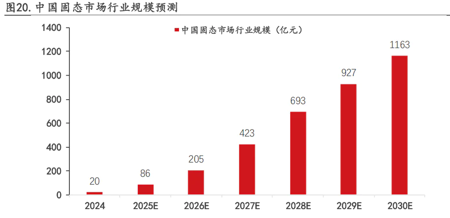 根据前瞻产业研究院的数据,2024年中国固态电池行业市场规模已经达到20亿元,2025年预计达到86亿元,2026年将进一步增长到205亿元,2030年中国固态电池行业市场规模将达到1163亿元。