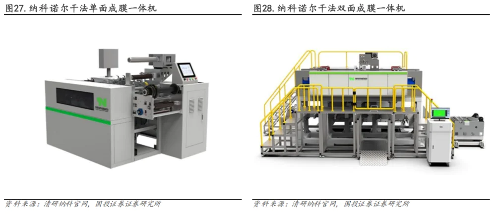公司战略聚焦固态电池设备前沿,2023年与清华研究院合资成立深圳清研纳科,公司持股40%,致力于研发干法电极成膜复合一体化设备,推动硫化物固态电池量产。纳科诺尔针对固态电池、电极制备的工艺难点,发力干法电极、固态一体化设备,目前清研纳科已经发布多款干法电极设备。
