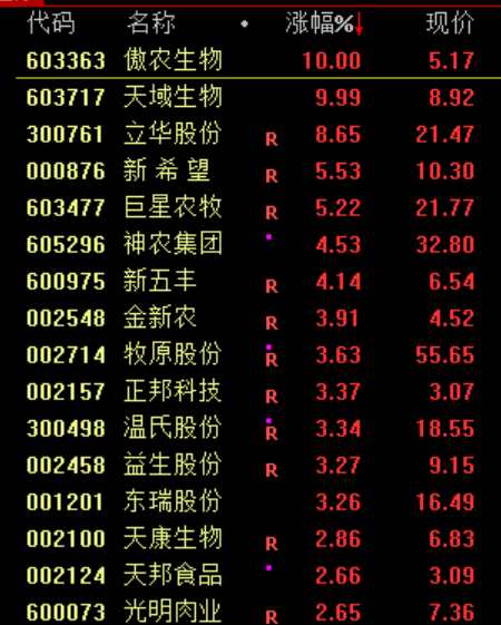 猪肉股表现强势,傲农生物等封板。
