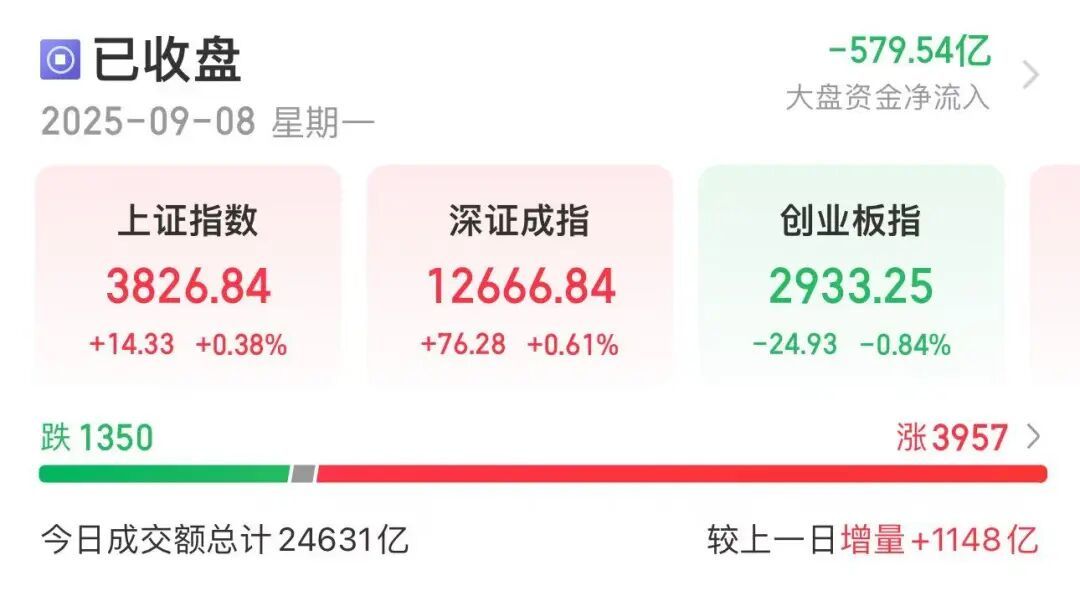 9月8日,A股三大指数表现不一。收盘时,上证指数上涨0.38%,深证成指上涨0.61%,而创业板指下跌0.84%。全市场成交额约2.46万亿元,近4000只个股上涨。