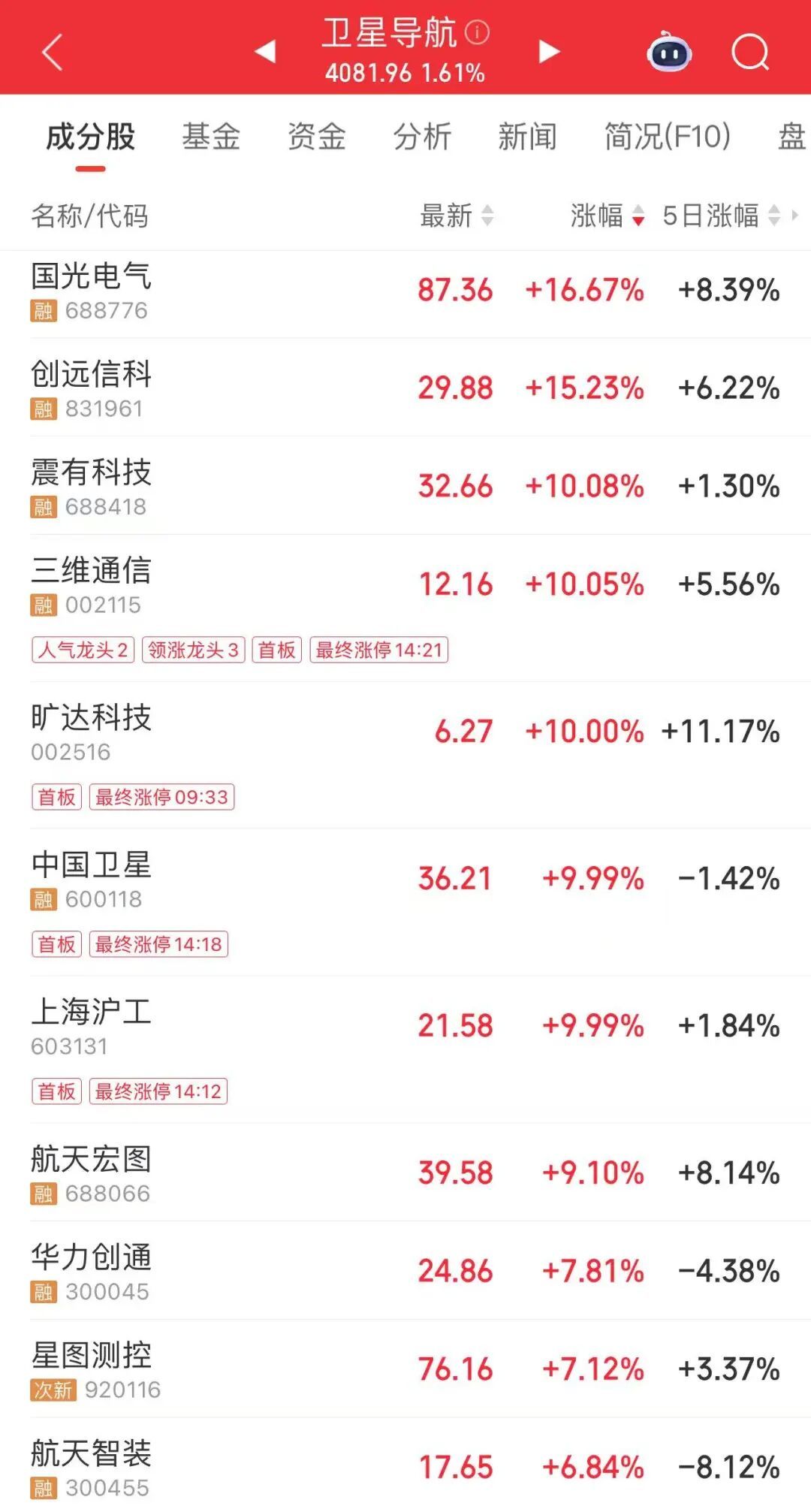 卫星导航板块午后快速拉升,收盘时,中国卫星、上海沪工、三维通信等多只龙头股涨停。同花顺热榜显示,三维通信午后热度快速上升,升至同花顺个股人气排名第一。