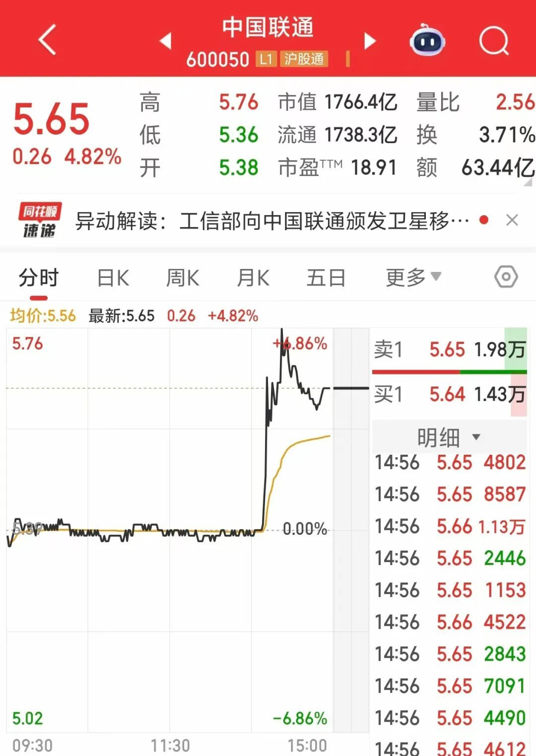 今日午后14:10左右,中国联通A股快速拉升,盘中一度涨超6%,收盘时涨幅为4.82%,股价报5.65元/股,最新市值1766亿元。