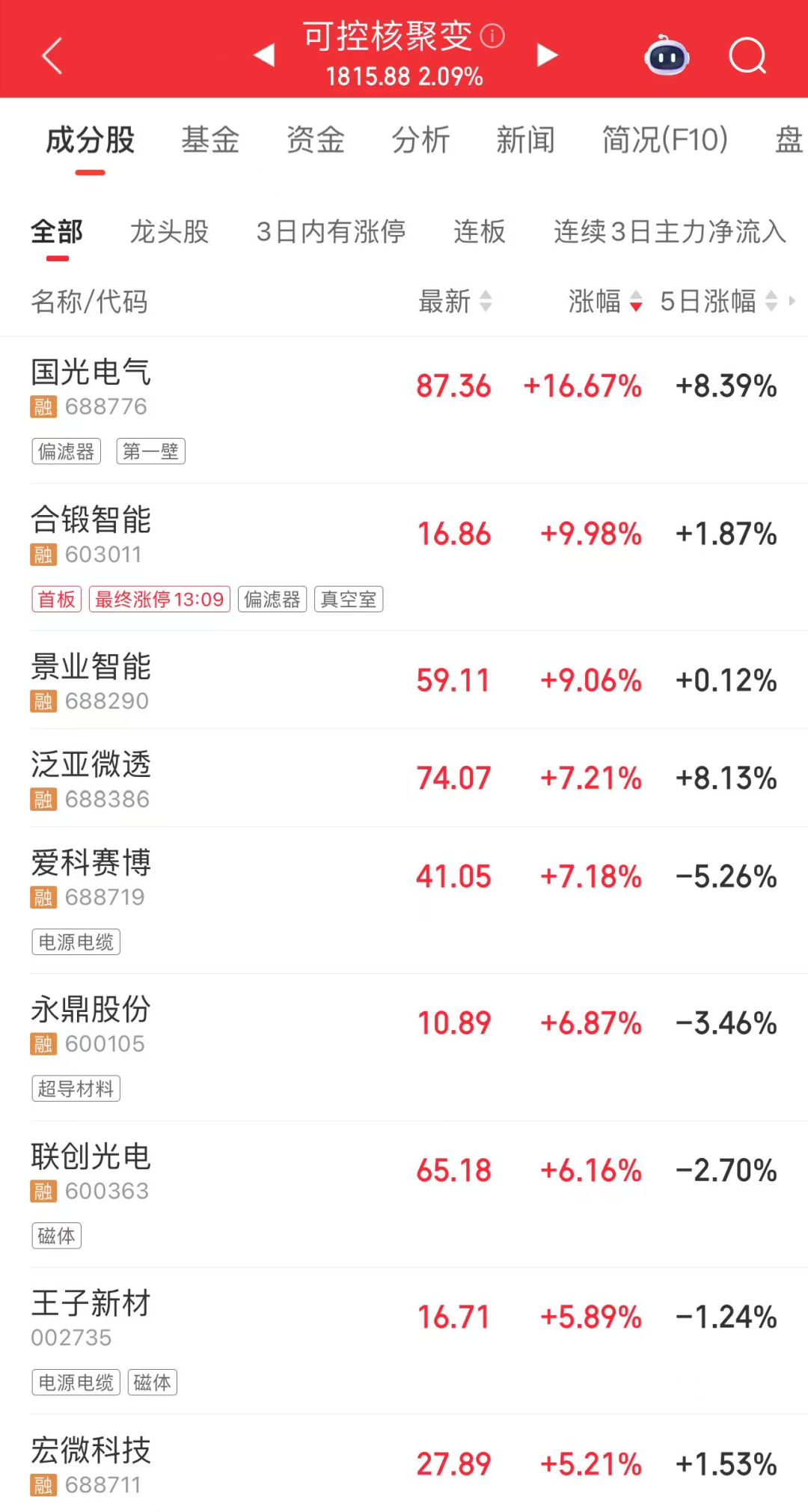 可控核聚变概念股午后持续走强,收盘时,合锻智能涨停,国光电气涨幅超16%。