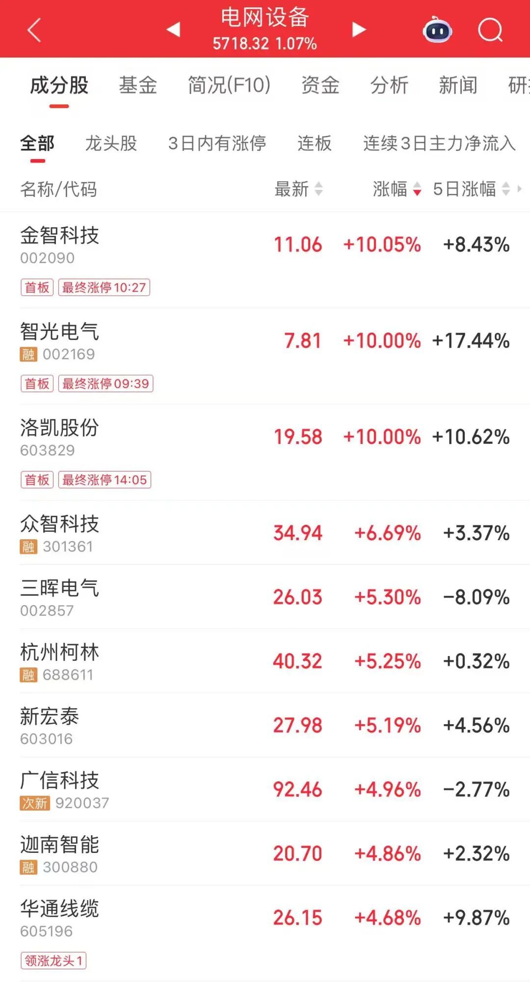 今日,电网设备板块持续活跃,收盘时,金智科技、智光电气等涨停。