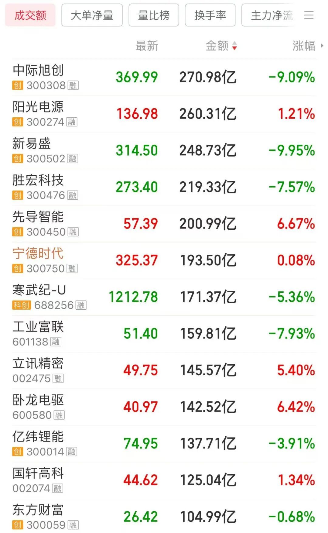 值得关注的是,中际旭创、寒武纪 - U等13只个股今日成交额超100亿元,这些个股大多是大市值科技龙头股。
