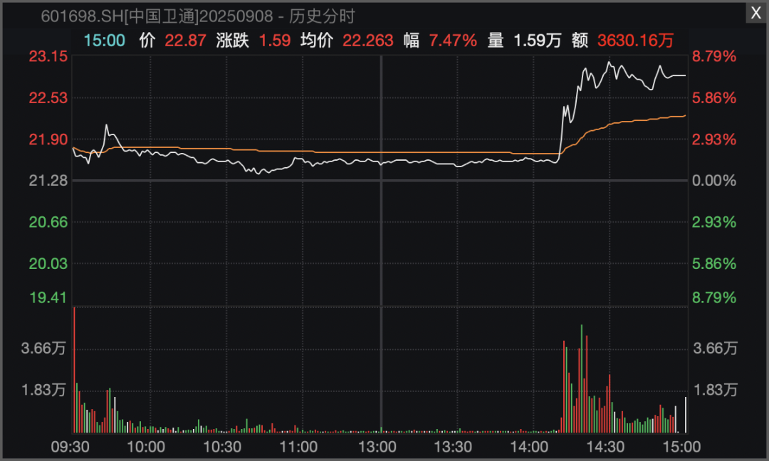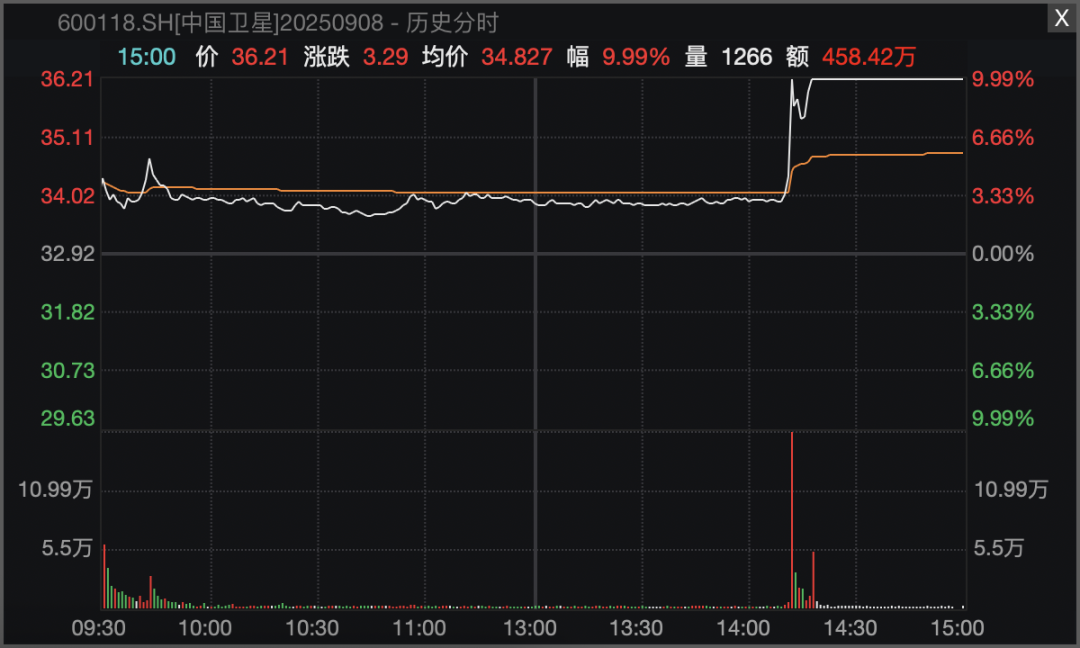 市场热点方面,航天装备概念午后表现强劲,板块指数临近收盘时急速拉升,一度放量涨近7%,最后1小时成交接近前一交易日全天成交。中国卫星(600118)垂直涨停,中国卫通、中天火箭、隆达股份等尾盘均出现异动拉升。