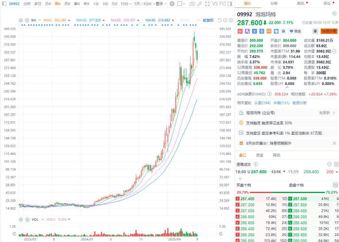 泡泡玛特,营收规模超百亿,全球开有7600多家店铺,股价2年飙涨十几倍,近期市值超4000亿港币,动态PE一度接近60倍。即便相对消费行业普遍20倍的估值大幅超卖,也未让股民却步。