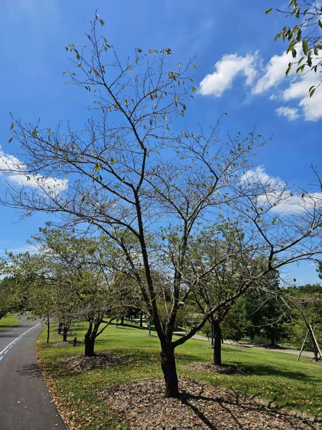 8月末,辰山植物园,一棵樱花树的叶子已基本掉完。(图/受访者供图)