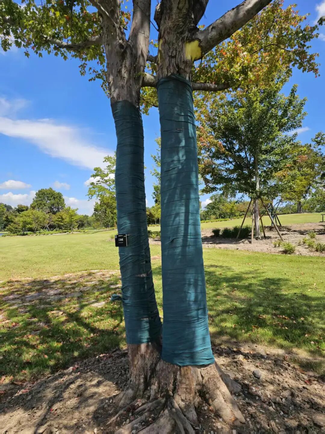 辰山植物园的工作人员在树干得不到荫蔽的植株上缠上布条,防止进一步灼伤,以防感染。(图/受访者供图)