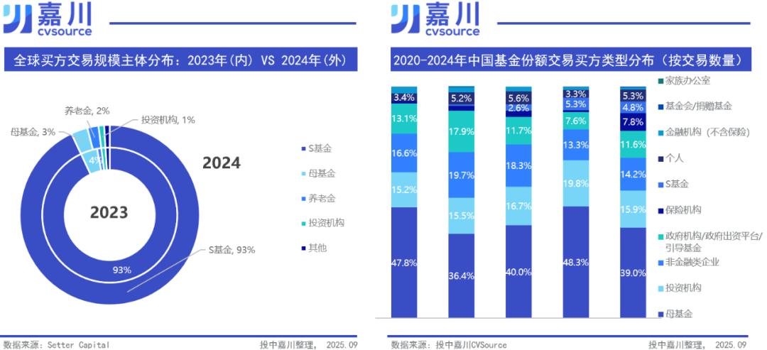 而且与美国市场不同的是,国资已经成为了S交易的第二大卖方。投中嘉川CVSource显示,2020年,以政府机构/政府出资平台/引导基金代表的国资,只在S交易的卖方市场中占比6.9%(按交易数量统计),排在第四位;但短短两年后,就一跃成为第二大卖方,并且在22年、23年和24年,一直维持着20%左右的占比,凸显出国资退出的迫切需求。