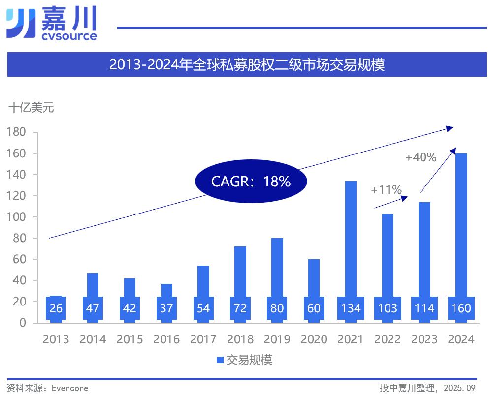 而且海外市场S交易“募投双旺”,据Evercore披露的数据,全球的S交易从2013年的260亿美元,已经发展到2024年的1600亿美元。即使中间有部分年份下降,10年CAGR(年均复合增长率)仍高达18%。尤其是最近两年增长强劲,2024年交易规模相比于2023年同比增长40%(见下图)。