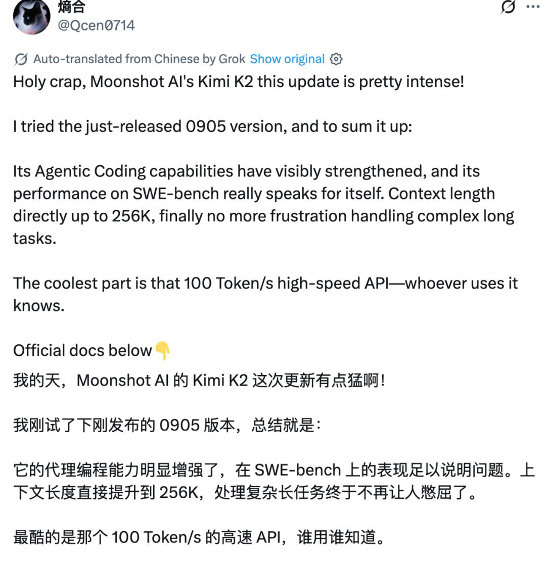 有人评价最新的Kimi - K2 - 0905:“终于不用再为处理复杂的长任务而感到挫败了。”