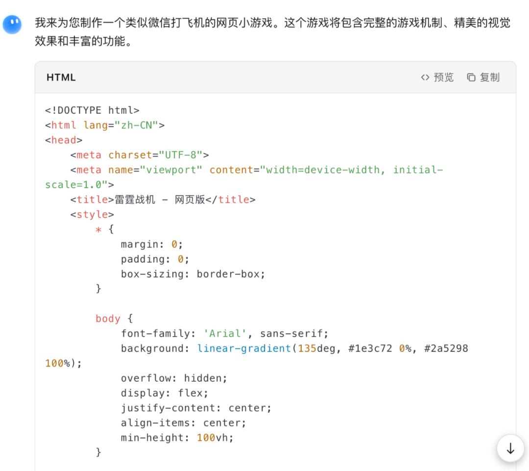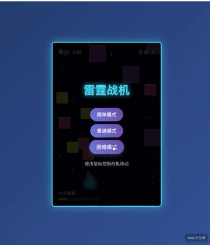 指令为:“制作一个和微信打飞机类似的网页小游戏,需要美观,好玩,功能齐全。”