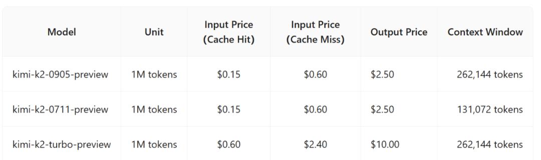 据悉,Kimi开放平台上架的kimi - k2 - 0905 - preview模型API,定价与上一代一致,计费方案为缓存未命中时每百万输入tokens/4元,缓存命中时每百万输入tokens/1元,每百万输出tokens/16元。详细定价策略见下图: