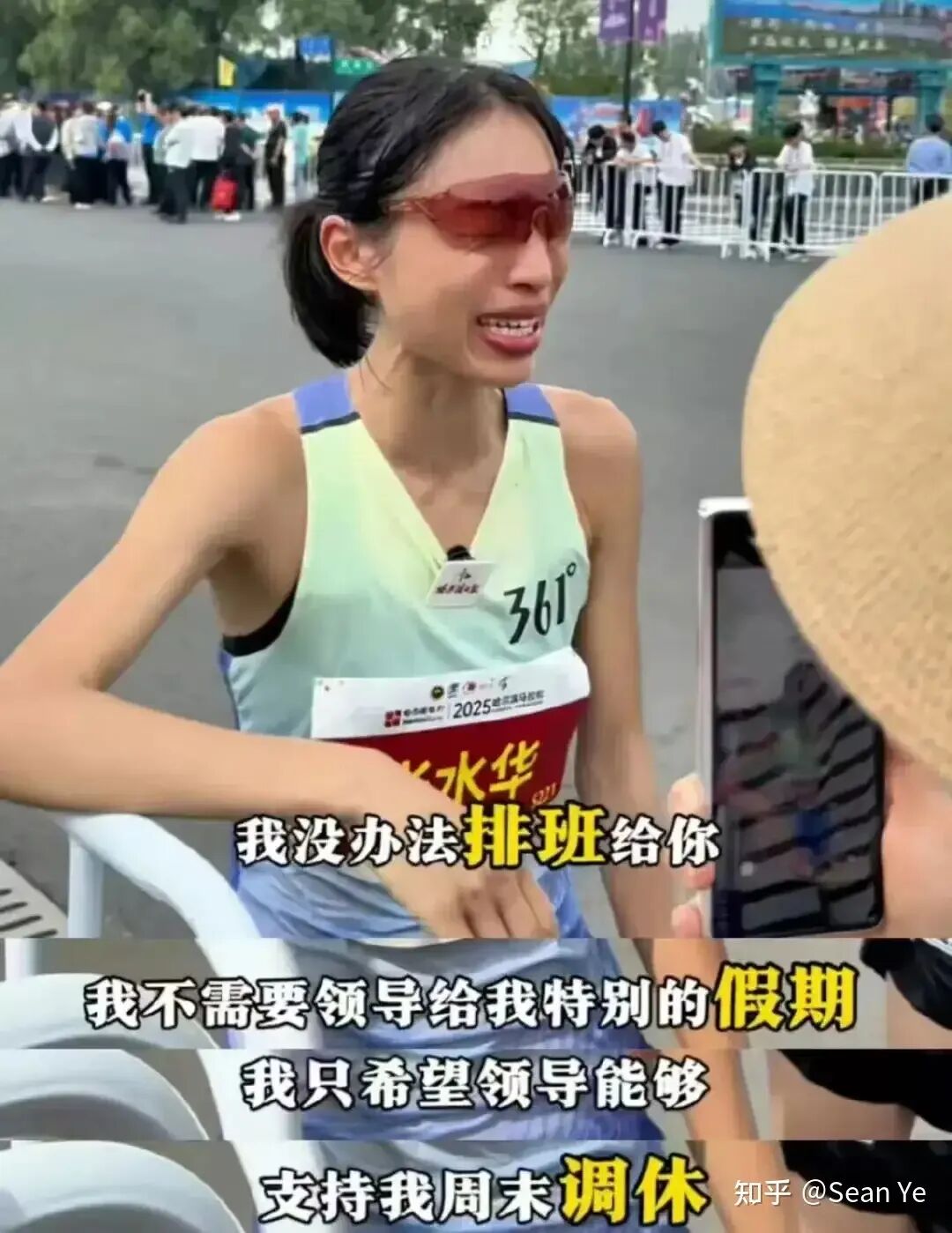 当她提到领导说参加比赛是个人业余爱好,需自己跟同事调班,她表示自己努力跑,争取好成绩,却得不到领导理解和配合,领导还添堵。她还称参加比赛很不容易,自己只希望领导给周末调休,要求并不高,可还是得不到支持。