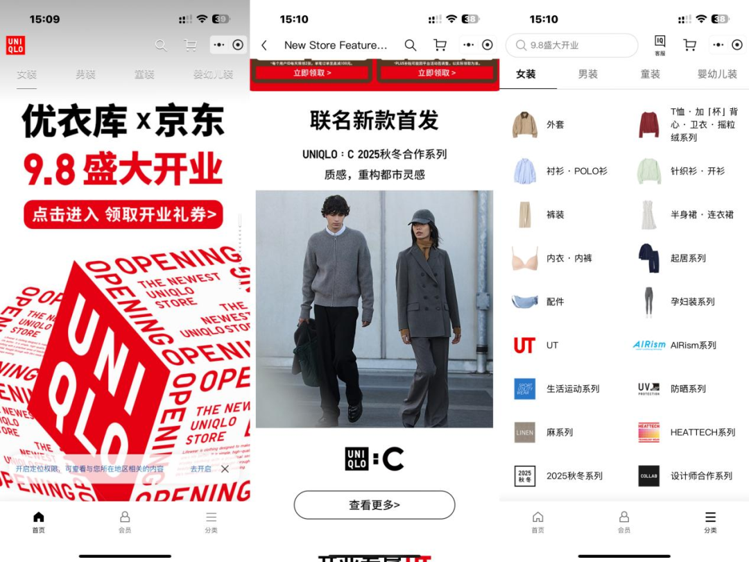 其次,这种模式保证了品牌调性的统一。过去在部分平台,由于库存交叉、系统兼容性等问题,品牌难以完全掌控用户接触点,容易出现“形象稀释”的情况。作为全球快时尚的标杆,优衣库对形象和标准化体验十分敏感,而小程序模式就相当于把“官网搬进京东”,所有页面设计、商品展示和上新节奏都由优衣库主导,实现了调性和体验的高度一致。