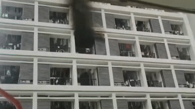 2020年9月29日,海南三亚一高校学院宿舍楼着火。动图显示,明火从屋内扩散至阳台,有男子试图在隔壁用灭火器灭火。学校后勤工作人员称,疑似学生刚恢复电后使用电器不当造成火灾。
