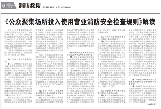 近日,强制性国家标准《公众聚集场所投入使用营业消防安全检查规则》(GB 46034 - 2025,以下简称《规则》)正式发布,将于2026年2月1日起实施。该《规则》由国家消防救援局组织制定,为加强公众聚集场所的消防安全管理、规范消防救援机构的行政许可行为提供了标准依据。