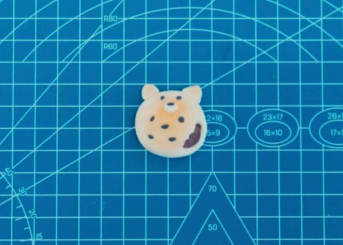 4. 贴上耳朵和嘴巴,最后用褐色超轻粘土搓成眼睛、鼻子和芝麻形状,对饼干进行点缀。