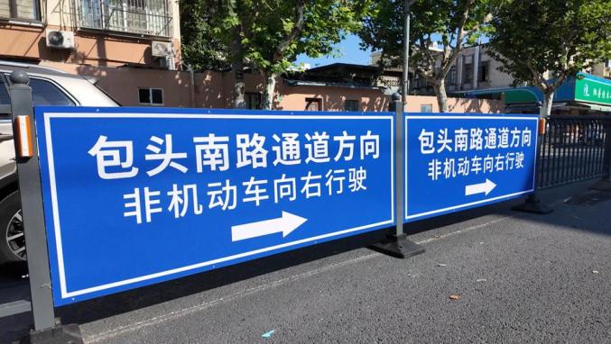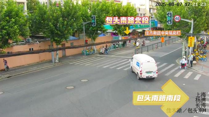 公共视频显示,包头南路南段和北段被佳木斯路中央隔离栏完全阻断,南段来的非机动车要去北段,只能逆行佳木斯路北侧非机动车道,交叉对冲风险极大。常路过此错位路口的市民朱先生说:“以前要从前面小区门口调个头回来,或者逆行过来,不然过不去,因为中间装了隔离栏。”