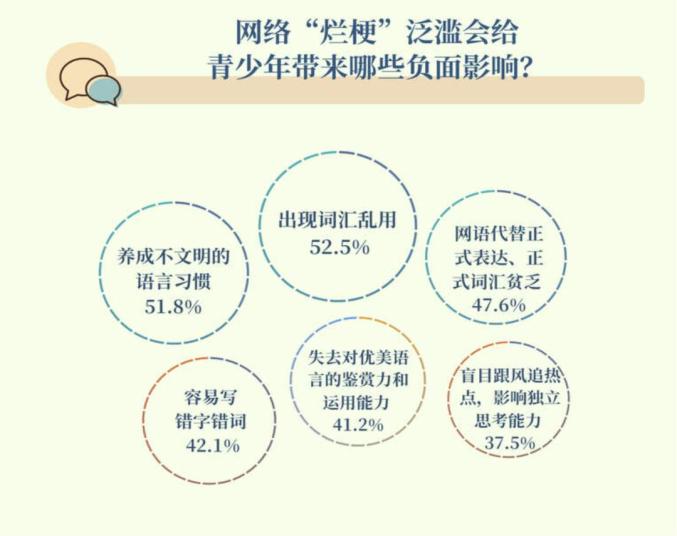 这并非网络“烂梗”首次引发担忧。此前,中国青年报的一项调查显示,69.0%的受访者担心网络“烂梗”泛滥影响青少年“好好说话”,受访家长的担心比例更高,达74.4%。超半数受访者认为网络“烂梗”会让青少年乱用词汇、养成不文明语言习惯。