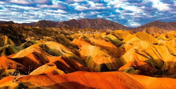 站在高处俯瞰,每座小丘都是独一无二的调色盘。有的以赤红为主,边缘镶着金黄;有的灰与白交织,中间却有惊艳紫蓝;还有层层叠叠的橙红、褐黄、土黄,像斜铺的彩条布,肆意宣泄着古老激情。