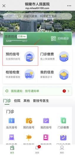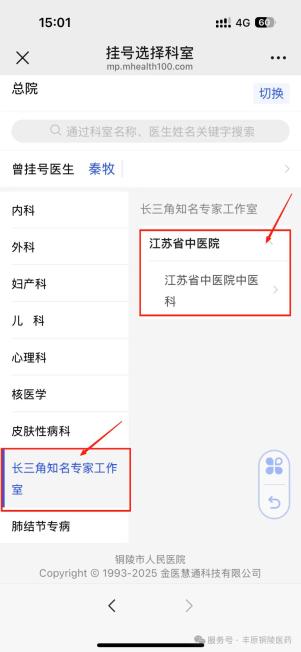 1. 打开铜陵市人民医院微信公众号,点击“导诊”,在新菜单栏依次选择“预约挂号-->铜陵市人民医院(总院)-->长三角知名专家工作室”: