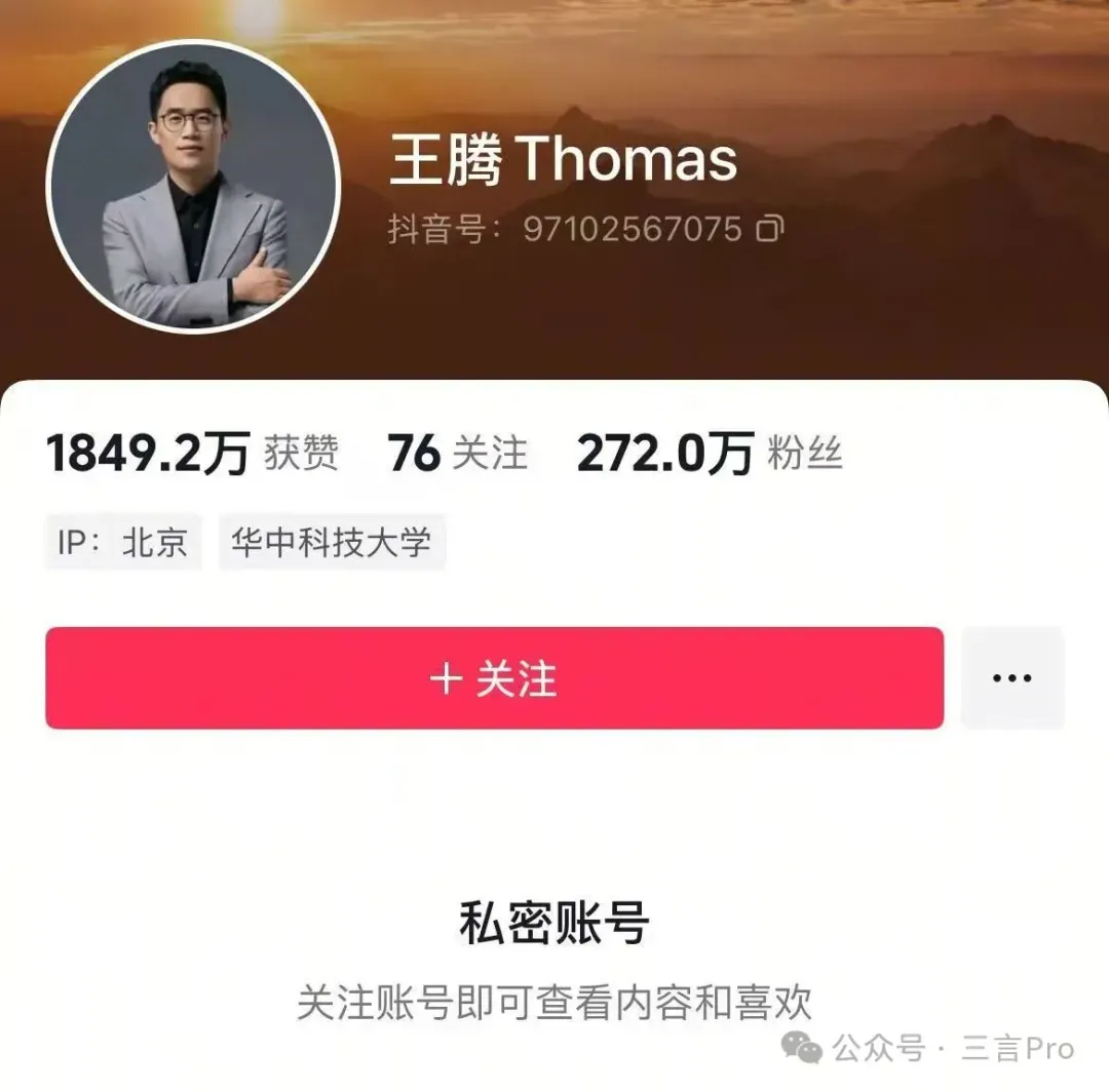 王腾的快手账号显示已被封禁,抖音账号也隐藏了所有内容,并设置了私密。