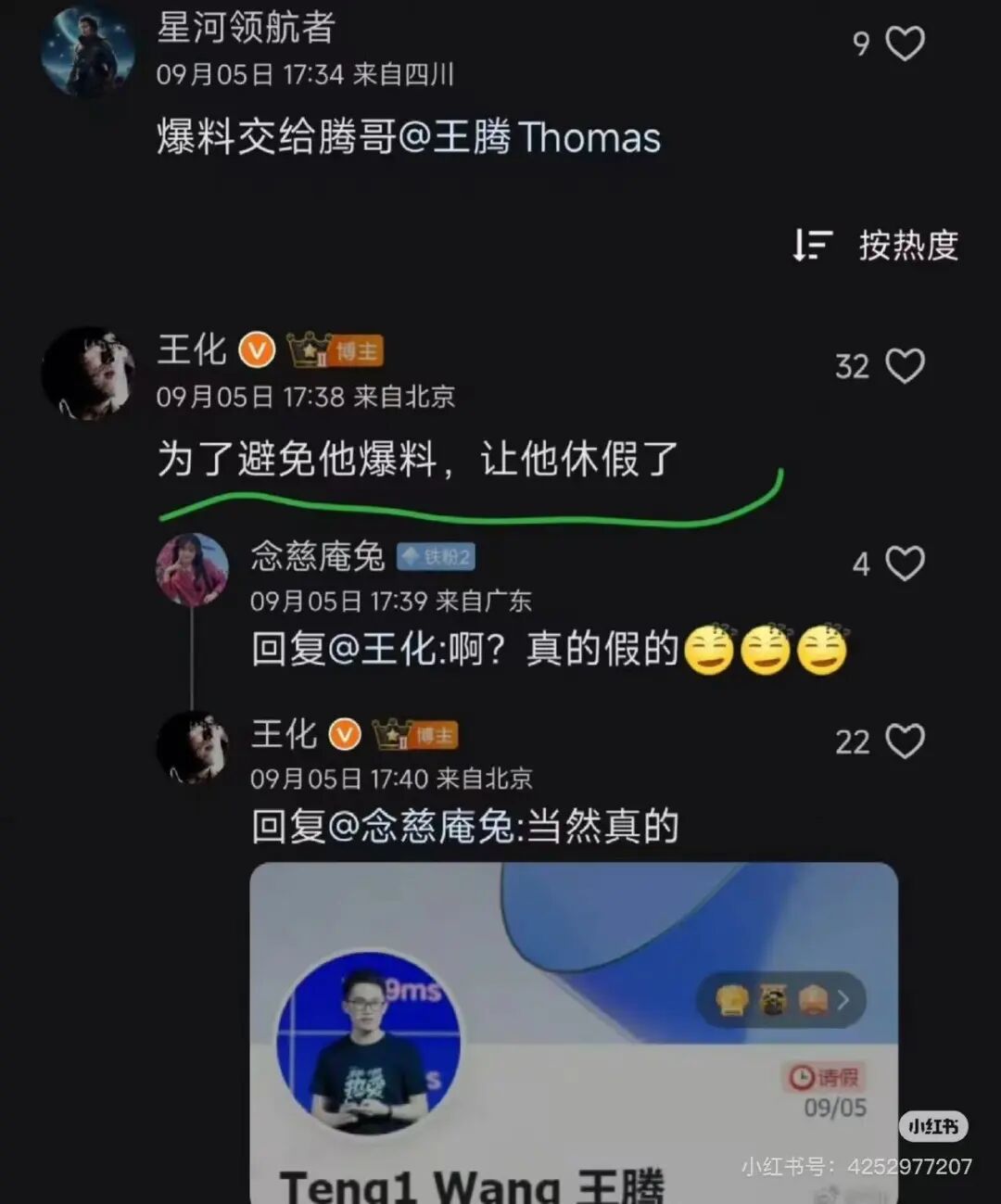 就在前几天,王化在回复网友时还戏称“为了避免他爆料,让他休假了”,有人说这一语成谶了。