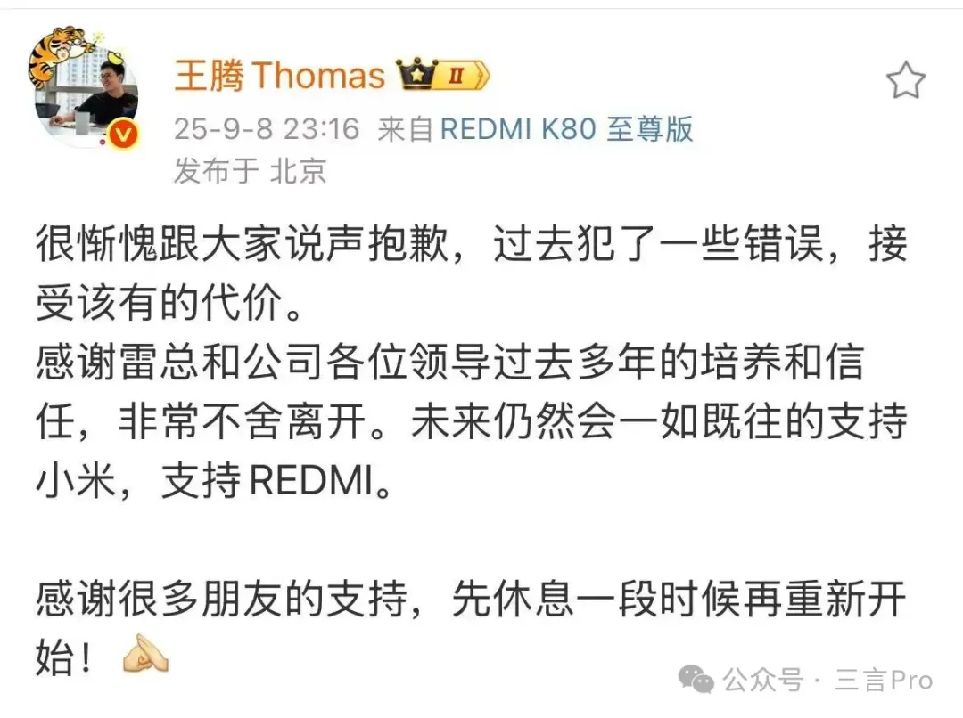 王腾微博账号删除了“小米中国区市场部总经理、REDMI品牌总经理”认证信息。其微博自8月29日后就再未更新内容。