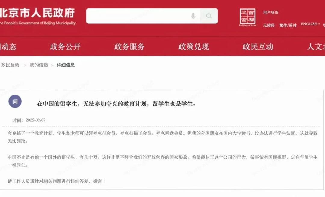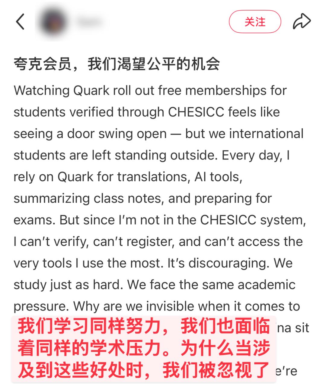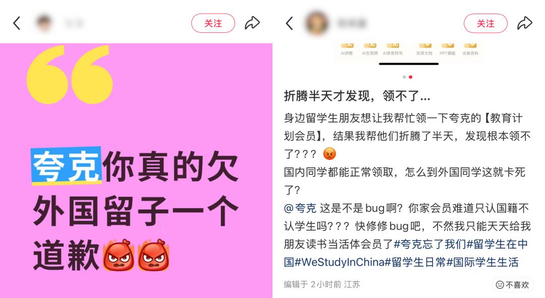 这波抗议还波及到了国内学生。很多中国网友答应帮留学生搞定夸克会员,折腾后发现因国籍问题领不了。这让网友觉得很没面子。