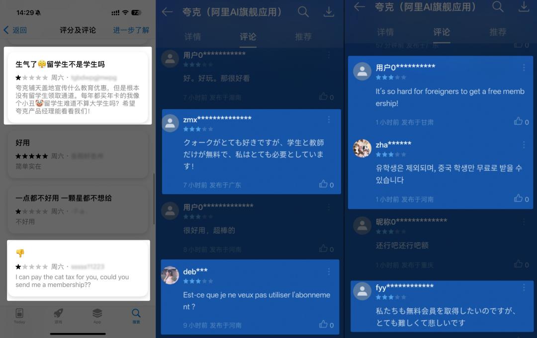 有些留学生很生气,跑到夸克的各大应用商店打一星差评。