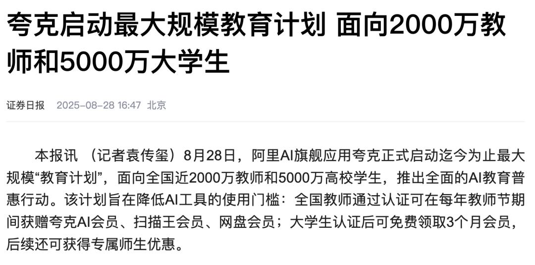 教师认证后,教师节期间可获赠夸克 AI 会员、扫描王会员、网盘会员;大学生认证后,可免费领 3 个月会员,后续还有专属师生优惠。