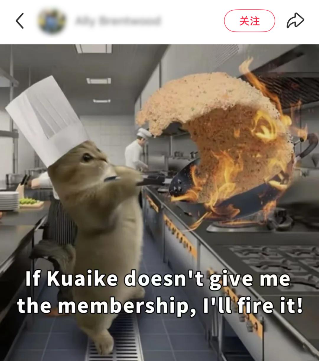也有态度强硬的,掏出做饭猫表情包放狠话:“如果夸克不给我会员,老娘就开了它!”不过这位留学生中文还得好好学,kua ke 不是 Kuaike。
