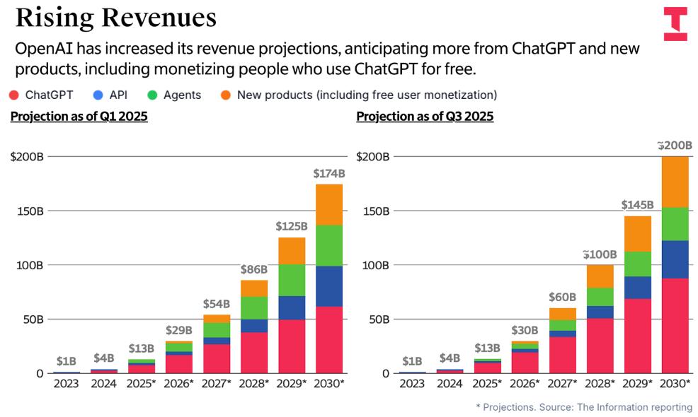 OpenAI向股东通报的今年预期总营收为130亿美元,是去年的3.5倍。同时,该公司预测到2030年,年总营收将达到2000亿美元。其中,ChatGPT的贡献比例显著提高。2025年全年,ChatGPT的收入将接近100亿美元,成为收入的绝对主体。到2030年,OpenAI预计仅ChatGPT这一项业务一年就能带来近900亿美元的收入。