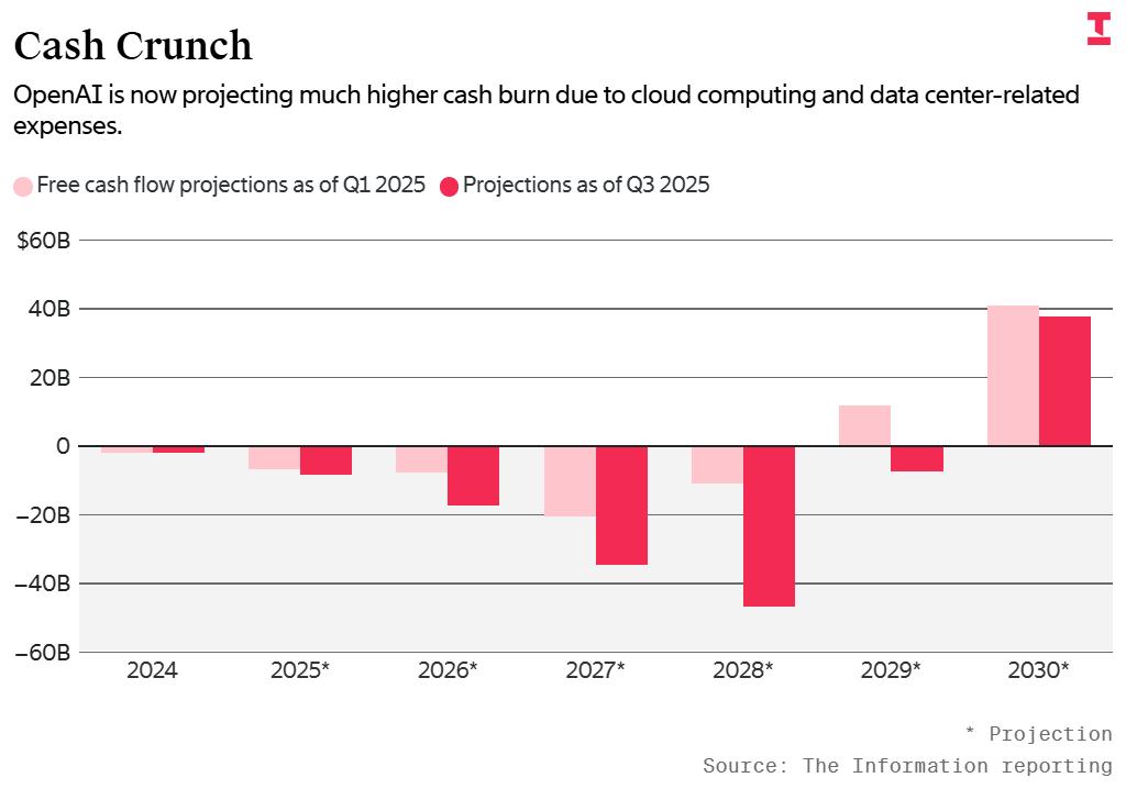 目前,OpenAI的烧钱情况严峻。2025年现金流出将超过80亿美元,较年初预估多约15亿美元。2025 - 2029年累计现金消耗将达约1150亿美元,服务器相关投入在本年代后期近1000亿美元。推理计算费用方面,2025 - 2030年累计超1500亿美元,比年初预估多出约110亿美元。训练计算费用方面,2025年超90亿美元、2026年约190亿美元,且预计至2030年持续增加。由于模型训练存在试错,准确成本难以确定。可以说,AI的发展不仅消耗资金,更消耗大量的能源。