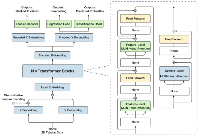 “极数”大模型采用transformer架构并优化。先对特征和目标进行embedding,再在样本和特征维度使用注意力机制,最后将高维特征传入不同模块支持不同功能。