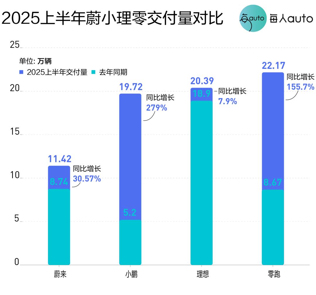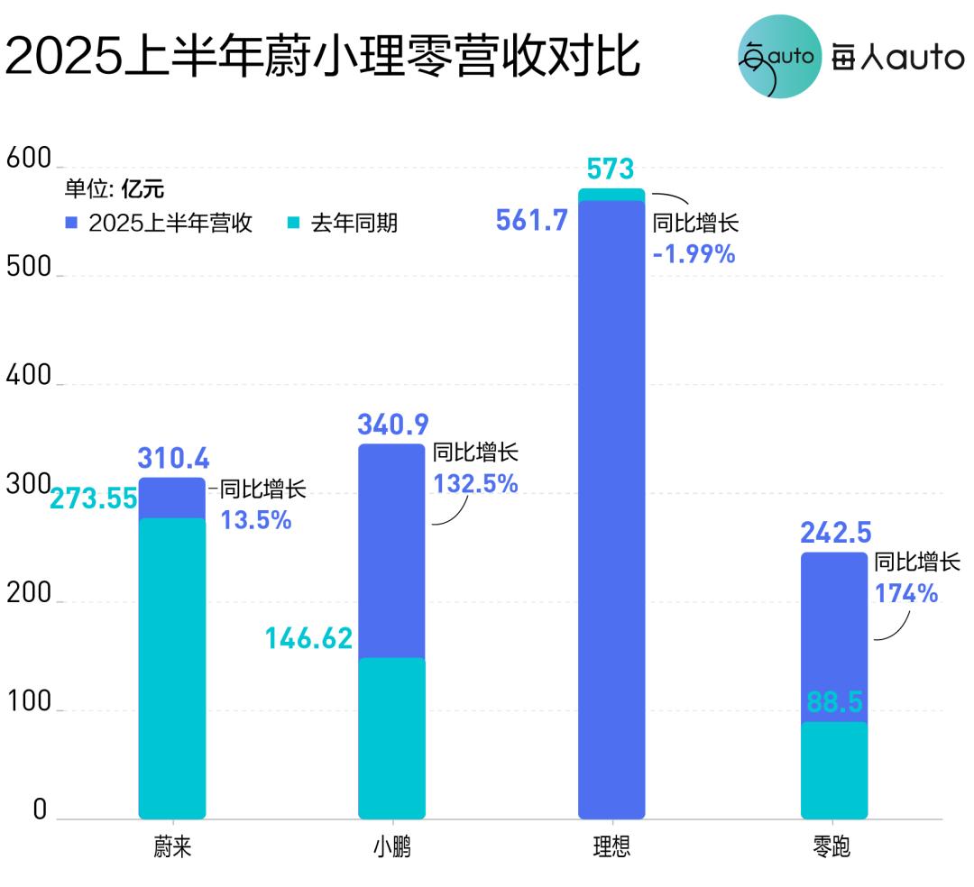 2025上半年蔚小理零营收与交付量对比。图 / 每人Auto