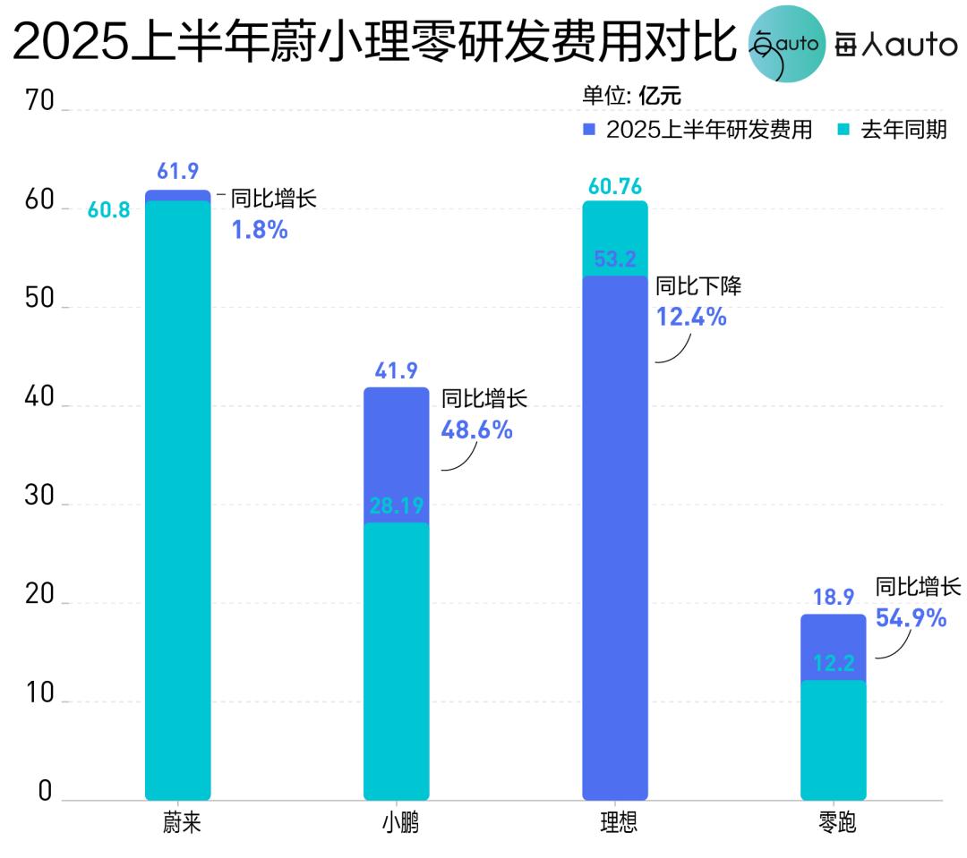 2025上半年蔚小理零利润与研发费用对比。图 / 每人Auto