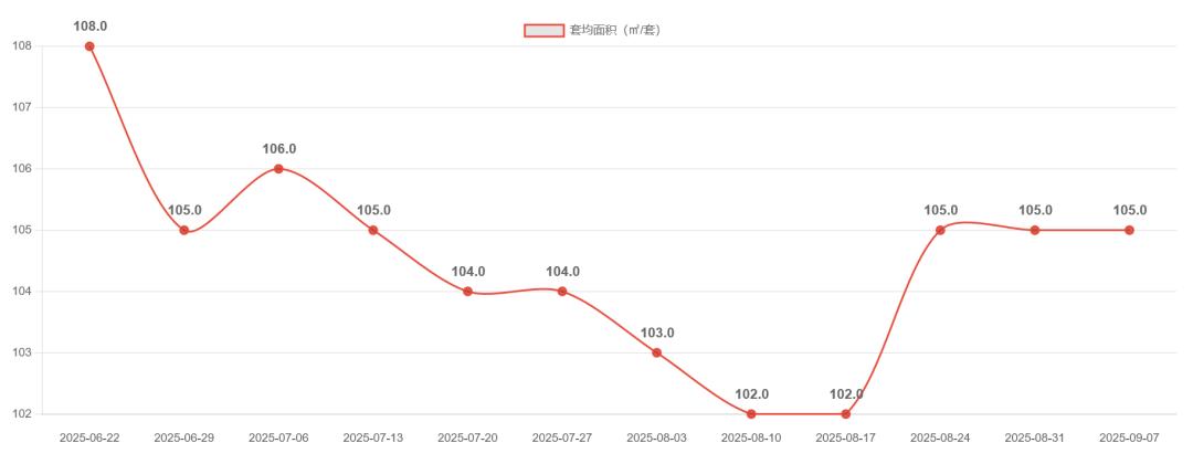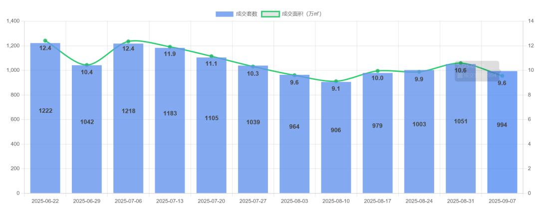 深圳二手房市场近期温和调整。截至9月7日当周,成交套数环比降5.4%至994套,成交面积降幅9.7%,套均面积降至96㎡,为6周最低。6周数据显示,成交套数8月中旬达1051套高点后连续两周回落,套均面积在100 - 102㎡波动,市场正结构性调整。当前成交量高于7月底低点(906套),价格敏感型需求占比或提升,需关注政策及季节性因素。