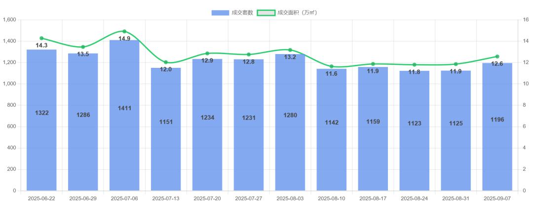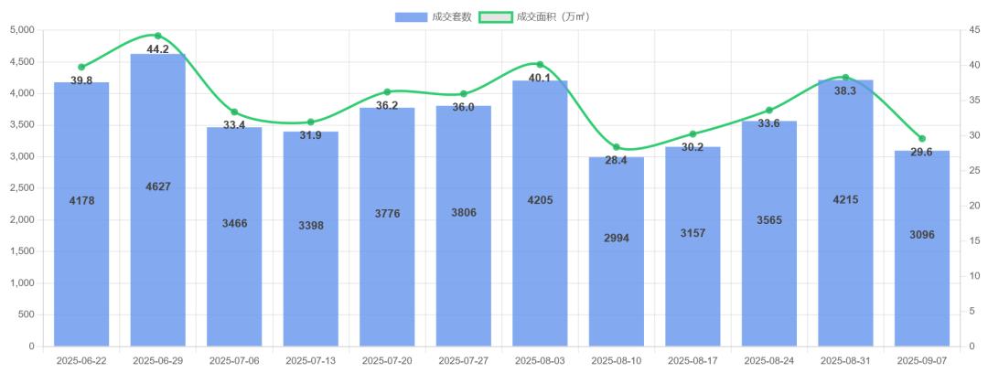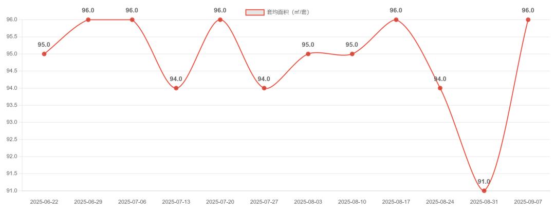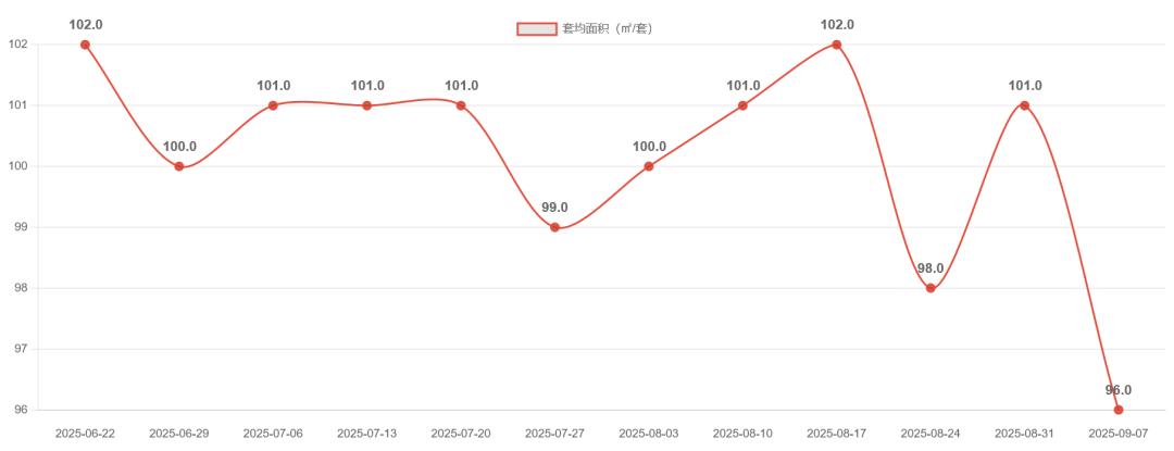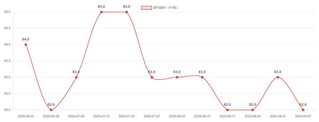 成都二手房市场近期波动明显。2025年9月1日至7日周度成交3096套,环比大幅降26.5%,延续前两周回落趋势(4215套→3096套)。6周数据显示,市场“冲高回落”,7月底至8月中旬成交升至4215套高点,随后连续两周回调。套均面积在91 - 96㎡,刚需户型主导。当前成交量回落至6周次低点,需关注是否形成下行趋势或季节性调整。