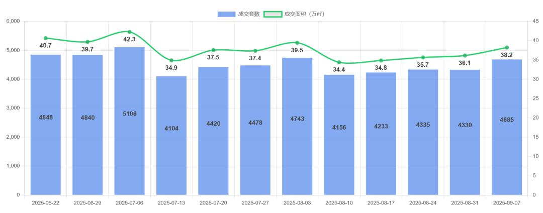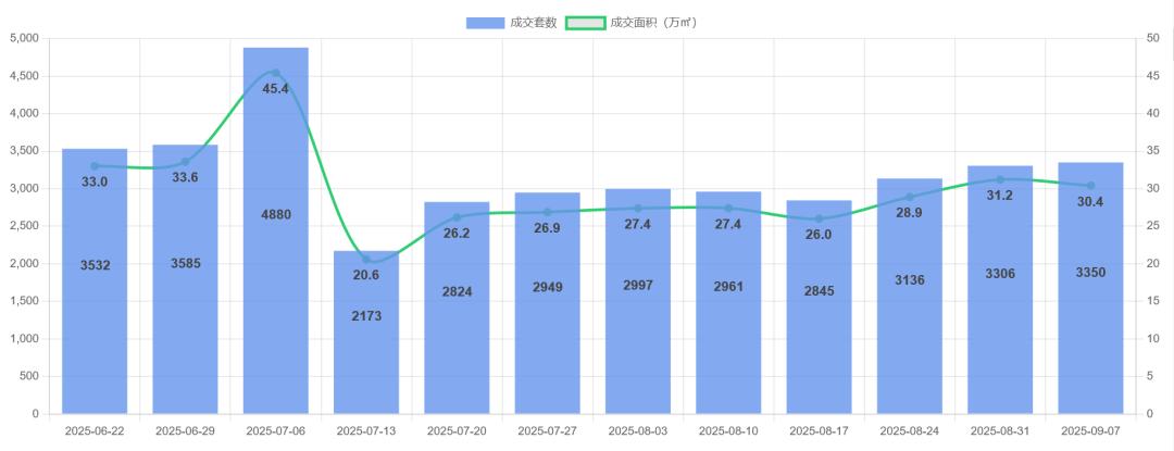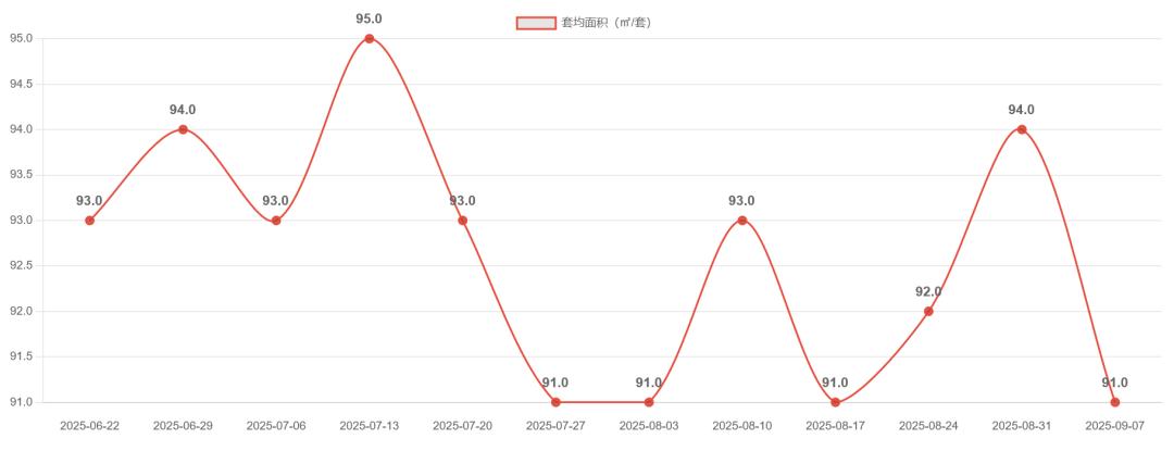 北京二手房市场近期温和复苏。2025年9月1日至7日,周成交3350套,环比增1.3%,连续5周增长;成交面积环比降2.6%,因套均面积从上周94㎡降至91㎡。近6周成交量从2845套低点攀升,累计涨幅17.8%,套均面积在91 - 94㎡波动。市场呈“量增价稳”,刚需小户型成交占比提升,首置需求释放,改善型需求谨慎。