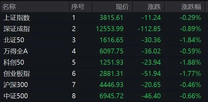 今日早盘,A股震荡调整,上证指数下探3800点支撑,创业板指、科创50、北证50等均跌近2%。超4000只个股下跌,成交呈现萎缩趋势。