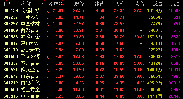黄金概念在今日再度走强,收盘时,晓程科技、恒邦股份、中国瑞林、西部黄金、赤峰黄金等均涨停,四川黄金涨超8%。