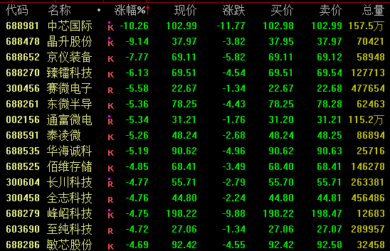 半导体板块盘中大幅下挫,收盘时,中芯国际跌超10%,晶升股份跌逾9%,京仪装备跌近8%,通富微电、华海诚科等跌超5%。