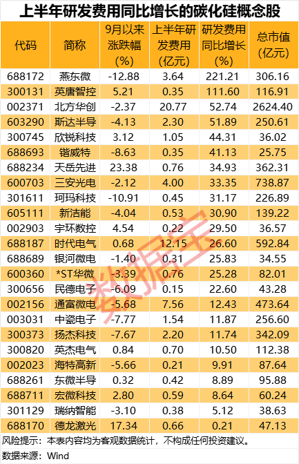 碳化硅概念股普遍重视研发创新。半年报数据显示,42只概念股今年上半年研发费用合计达105.05亿元,24股研发费用同比增长,燕东微、英唐智控、北方华创研发费用同比增幅居前,分别为221.21%、111.6%、52.74%。