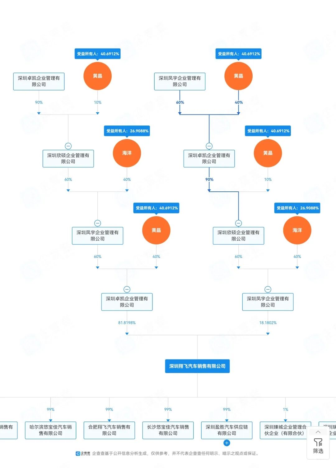 深圳凤宇企业管理有限公司与深圳欣硕企业管理有限公司还入股了一家名为深圳悠宝利新能源汽车销售有限公司,而悠宝利的控股股东是深圳宝驰威汽车销售有限公司,通过股权向上延伸,控股宝驰威的正是宝能汽车集团。