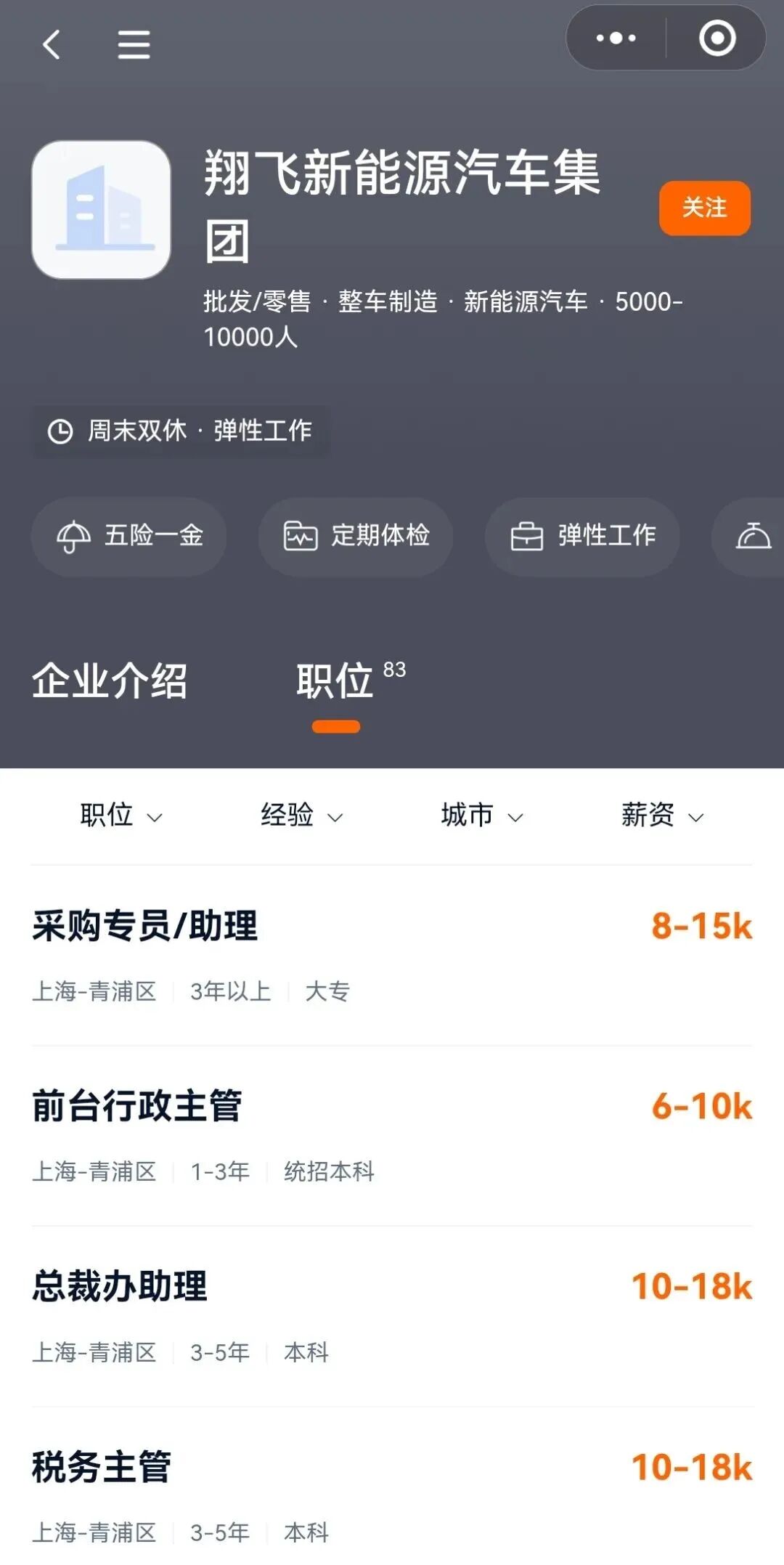 在招聘软件猎聘App上,威马“新股东”翔飞汽车发布了83个岗位招聘,地点主要在上海和温州,从前台主管、采购经理到各类产线工程师,薪资从5000元到30000元不等。
