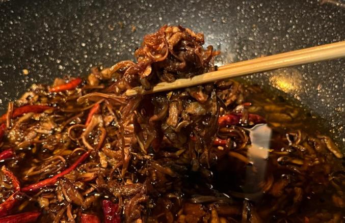 鸡枞菌的鲜美,讲究“鲜采快做”。新鲜的鸡枞菌去除根部泥土洗净,撕成条丝状沥干水分,锅烧热后,倒上本地的菜籽油,油热了就把鸡枞倒进去,“滋啦”一声,香气四溢。随后转中火慢慢熬炸,直至鸡枞水分炸干,再撒上一把干辣椒、一把花椒、少许盐,看着菌子从白润变得金黄酥脆,即可出锅。